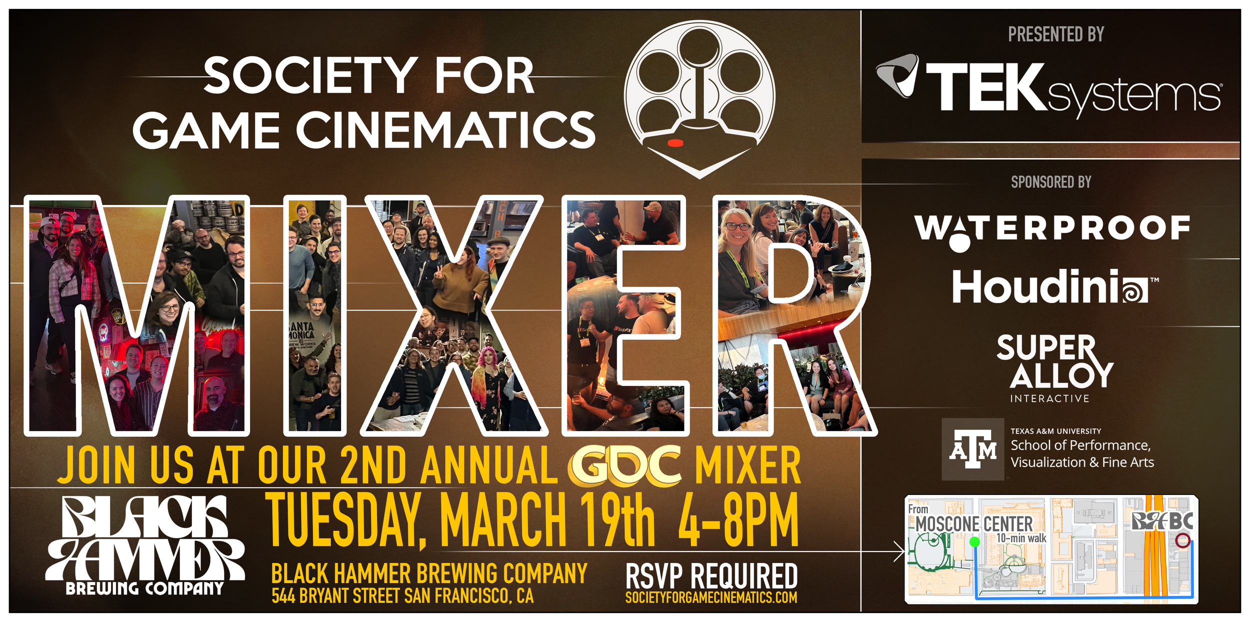 Society for Game Cinematics GDC Mixer Tuesday, March 19, 2024 4:00 PM 8:00 PM Google Calendar ICS Our first sponsored mixer at GDC! Thanks to sponsors TEKsystems, Waterproof, Houdini, and SuperAlloy Interactive - with student volunteer support from Texas A&M’s School of Performance, Visualization, & Fine Arts.